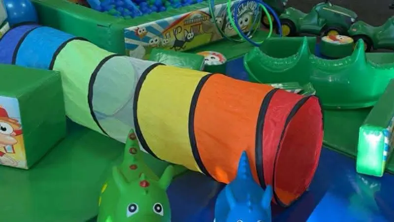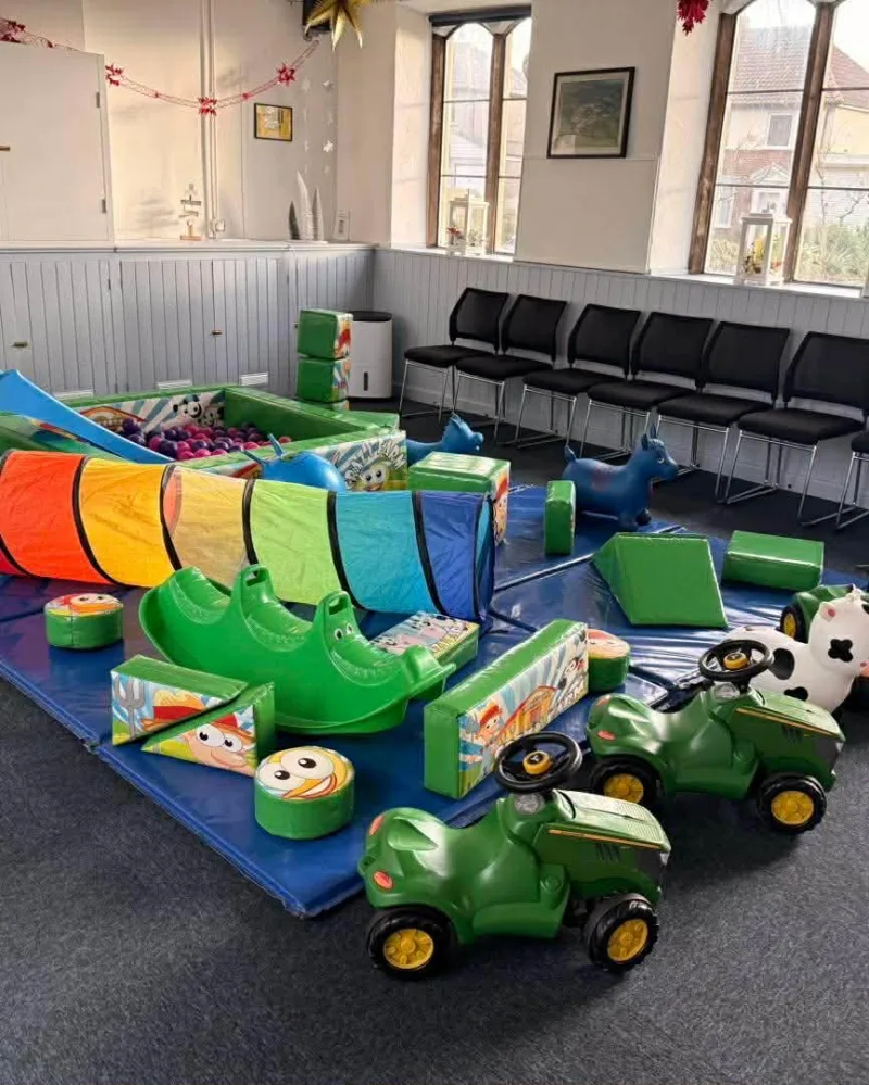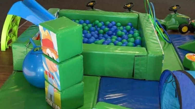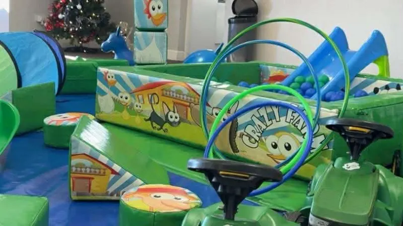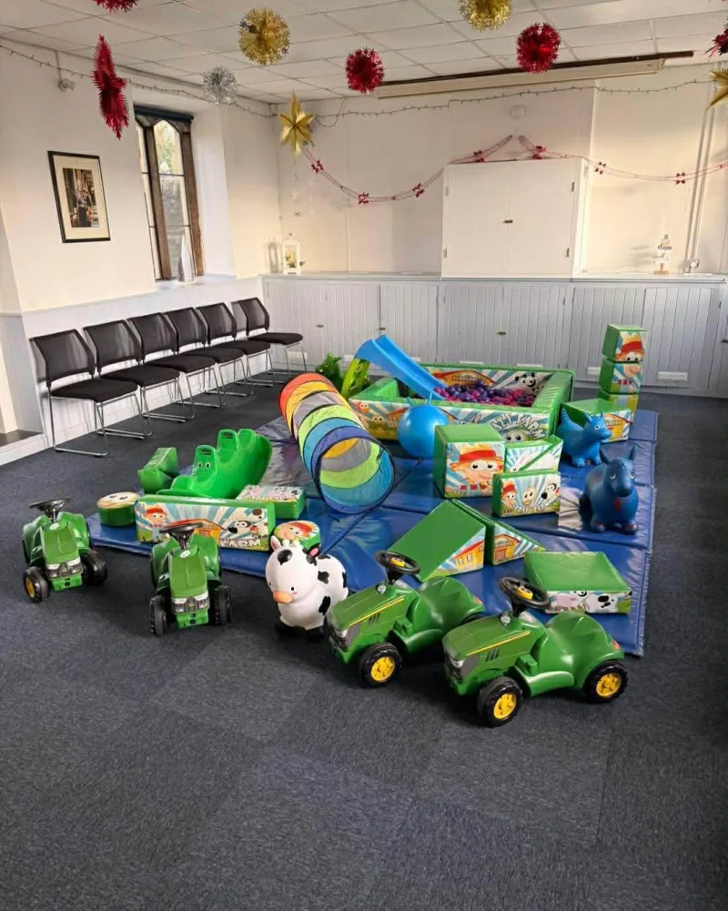 All of this along with a crawl through tunnel and toddler slide is set out on our bright coloured safety matting. The older toddlers can enjoy the ride on tractors and animal hoppers which are also included in this package.